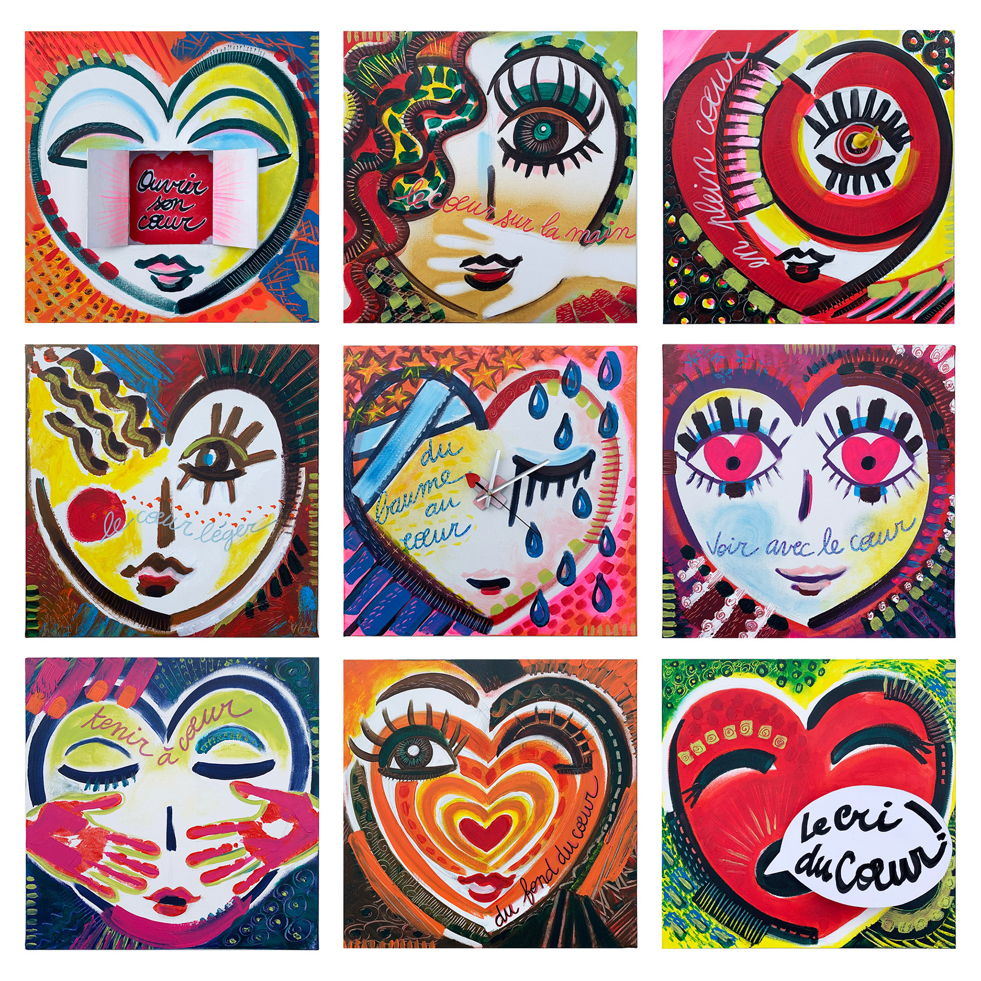 Illustrations d'expressions populaires de la langue française évoquant le mot "coeur". Ensemble de 9 toiles, format total 124 x 124 cm.