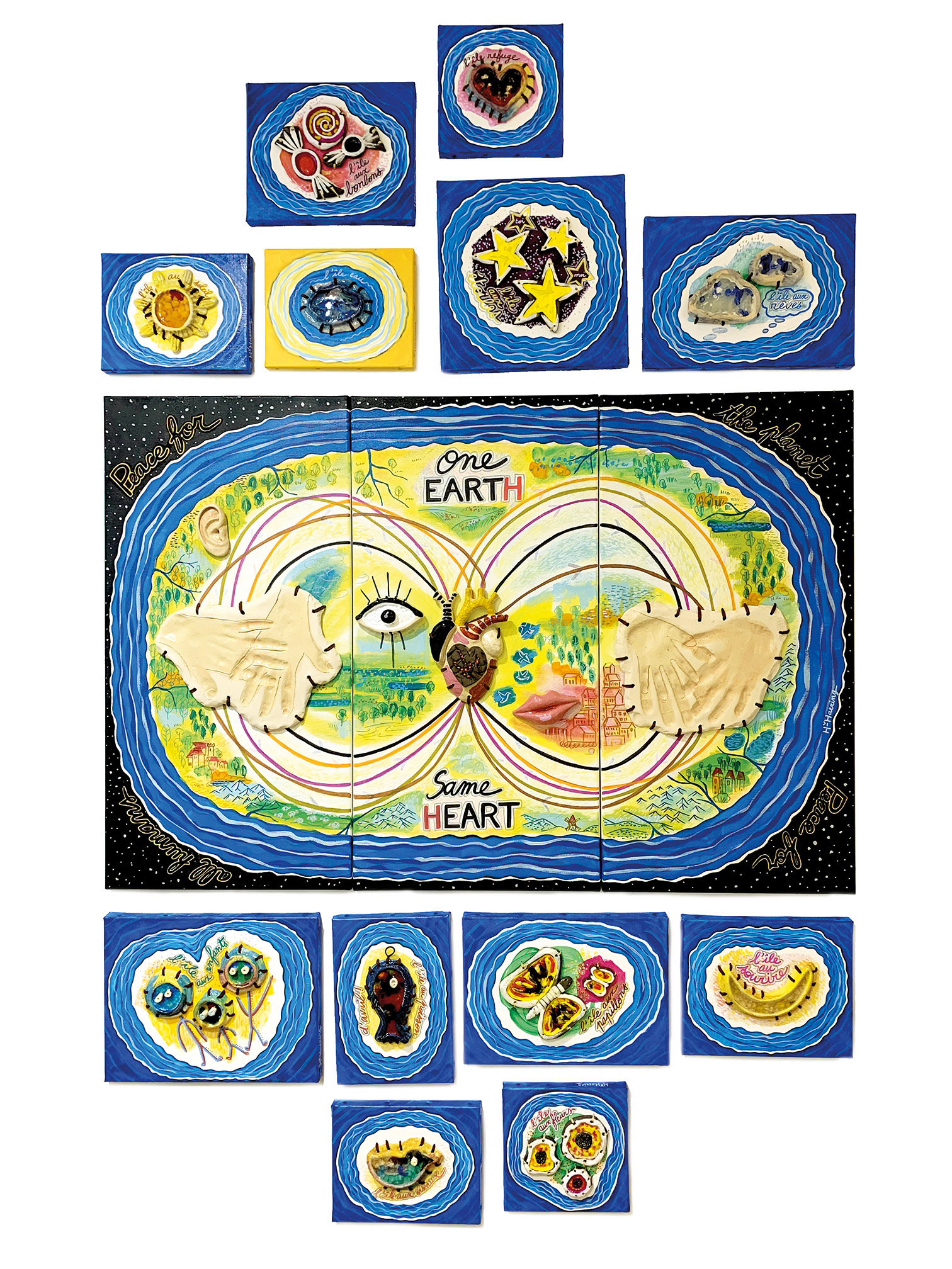 Ensemble format 187 cm H x 120 cm L - Acrylique, céramique, verre fondu, textile...