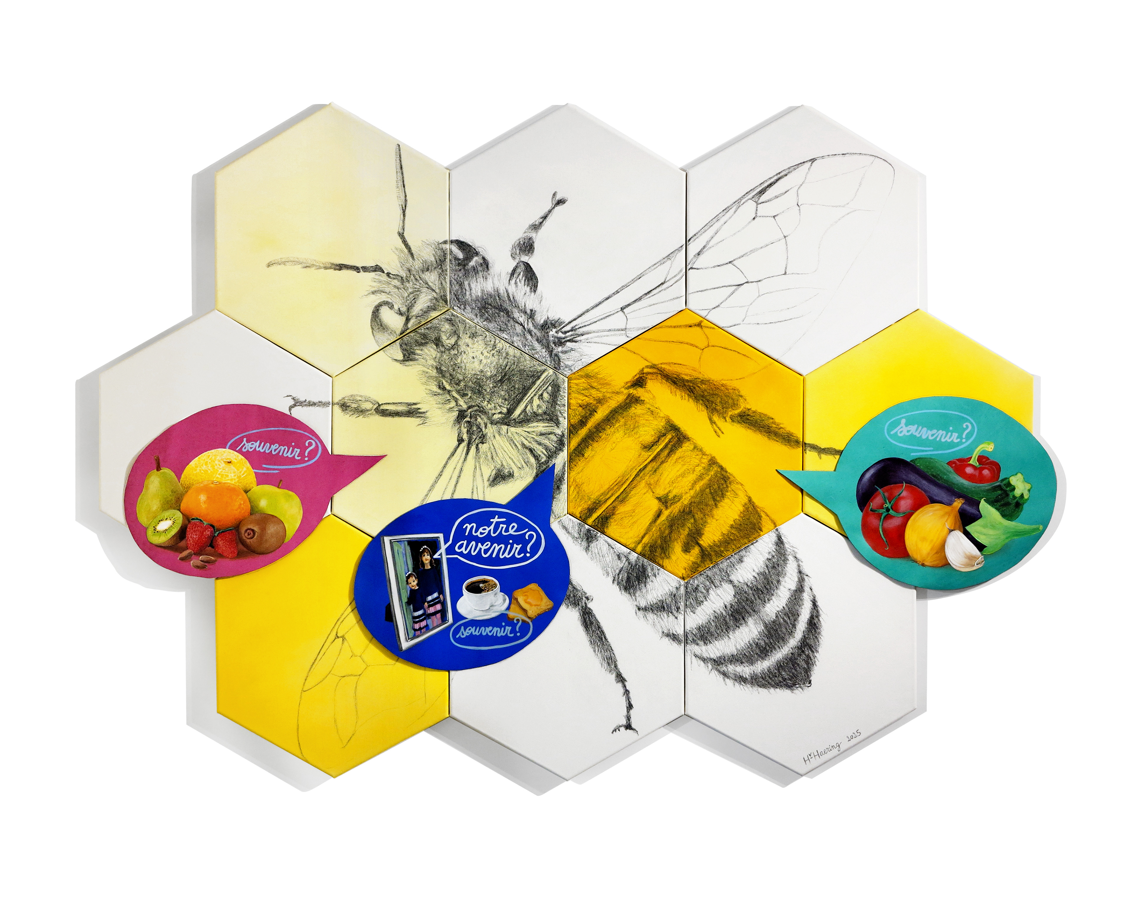 Format 142 cm x 100 cm H, assemblage de toiles et collages de cuir (recyclage de chutes), peinture acrylique, dessin à la mine de plomb. Fin de réalisation juste avant le scandale du votre de la loi Duplomb, prémonitoire !