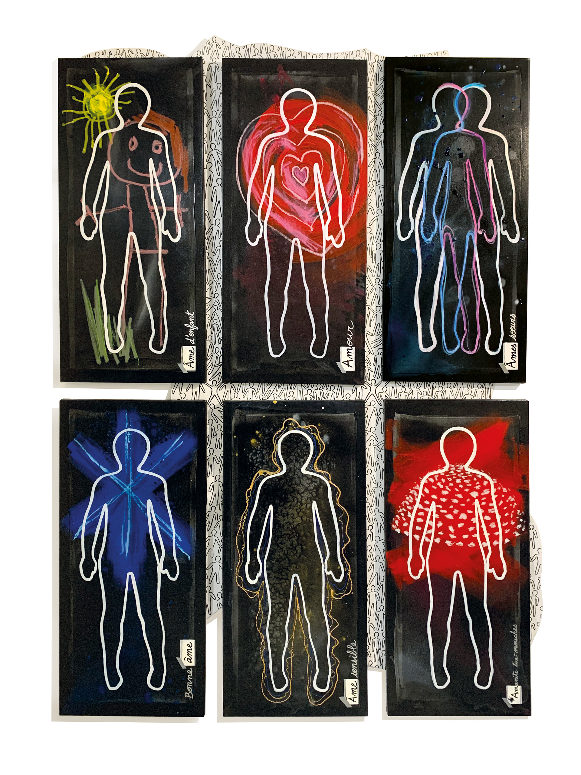 Ensemble de 6 toiles + fond en cuir, format total 135 L x 190 H cm. Jeu de mots avec "âme" : âme d'enfant, am-our, âmes sœurs, bonne âme, âme sensible et pour finir am-anite tue-mouches !