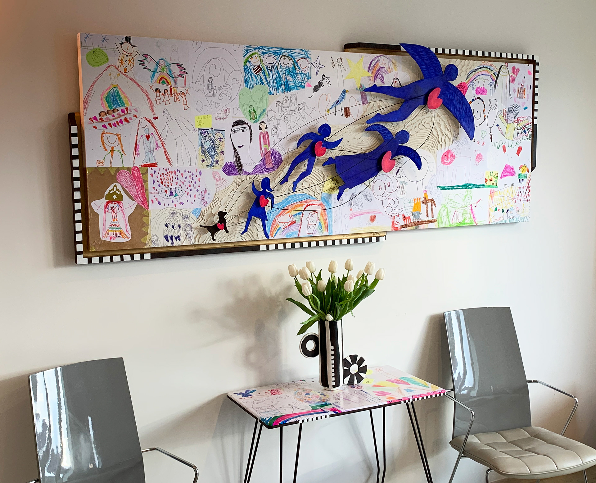 Collage de dessins des enfants, représentation de la famille... Installation dans la pièce de vie de la maison : format panneau 215 x 82 cm, habillage d'une console et création d'un vase.