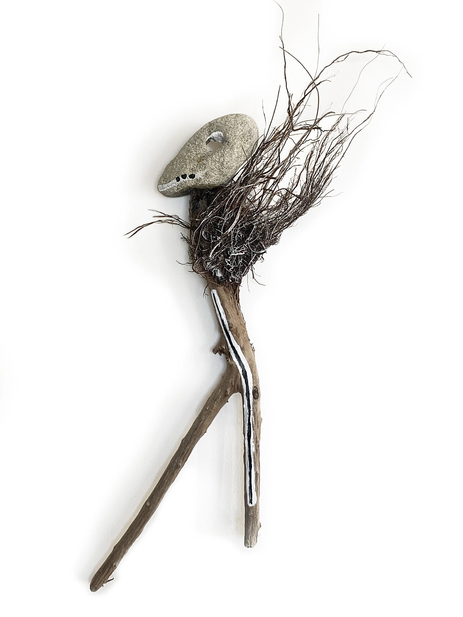 Matériaux collectés sur la plage : pierre et bois. Idée de disparition du vivant, des espèces...