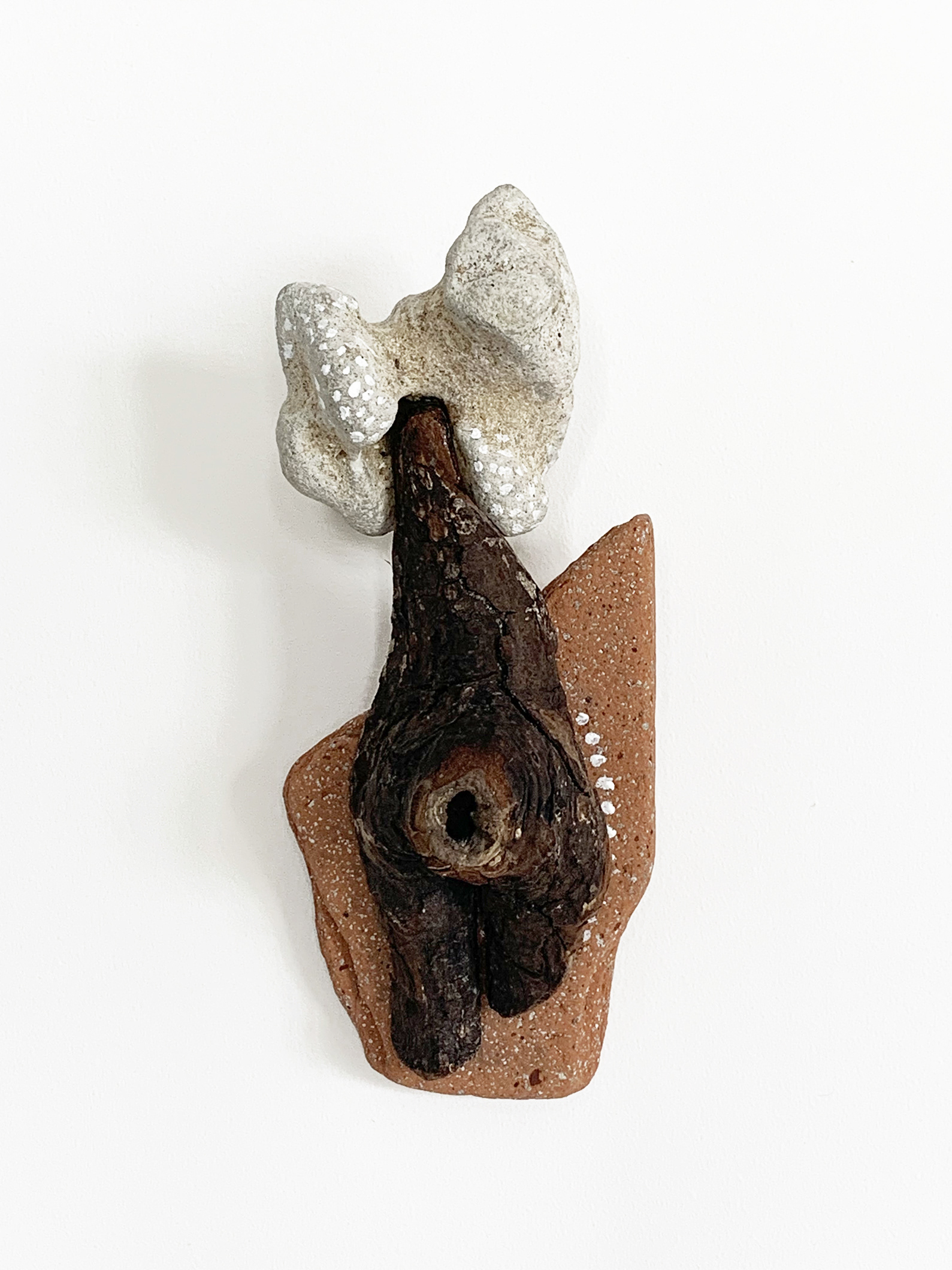 Matériaux collectés sur la plage : pierre, brique, bois, peints. À l'origine de la vie...